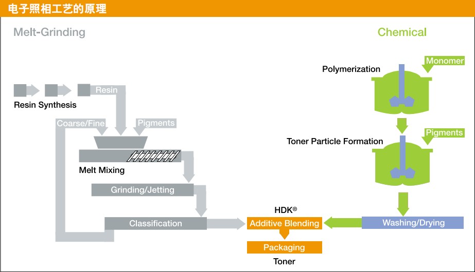 一般來說,粗碳粉中含有樹脂基料、著色劑和其他技術(shù)成分(CCAs、硅臘)。然后,在添加劑混合過程中往粗碳粉中加入少量的流動改進(jìn)劑(HDK®)。制備粗碳粉主要有